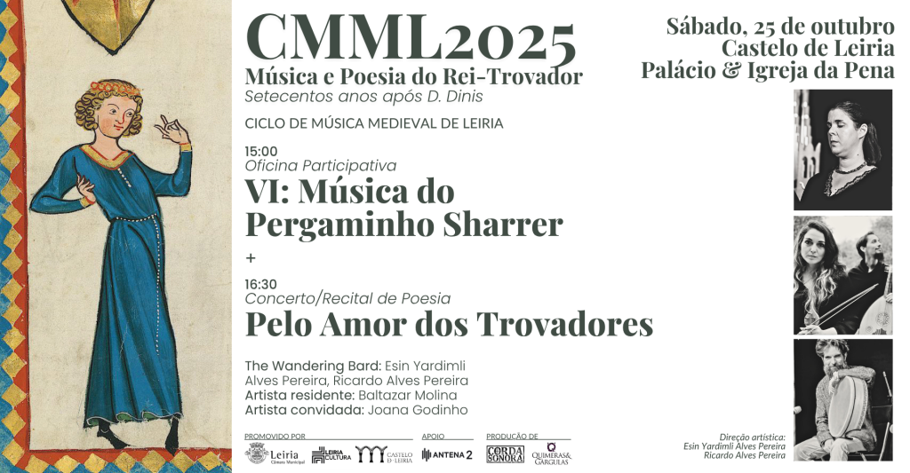 The Medieval Music Cycle of Leiria 2025 is a celebration of secular poetry and music from the troubadour tradition of medieval Portugal and the Iberian Peninsula. CMML2025 pays tribute to cantigas de amor, cantigas de amigo, and cantigas de escárnio e maldizer, highlighting the poetry of King Dinis, the Troubadour King, alongside troubadours and minstrels of his time, such as Martim Moxa, João Garcia de Guilhade, João Zorro, and Airas Nunes.